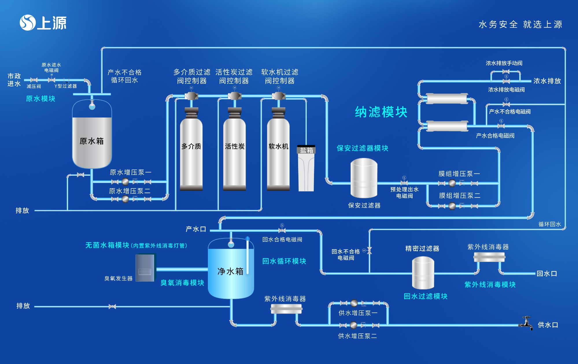 上源管道直饮水阳光房,集成了原水系统、超滤与纳滤膜处理系统、净水箱系统、臭氧紫外线双重消毒系统、分区供水系统、回水消毒系统、水质在线监测系统、安防报警系统、保温恒温系统及温湿度联动控制等标准化功能于一体,全程透明,运行一目了然。