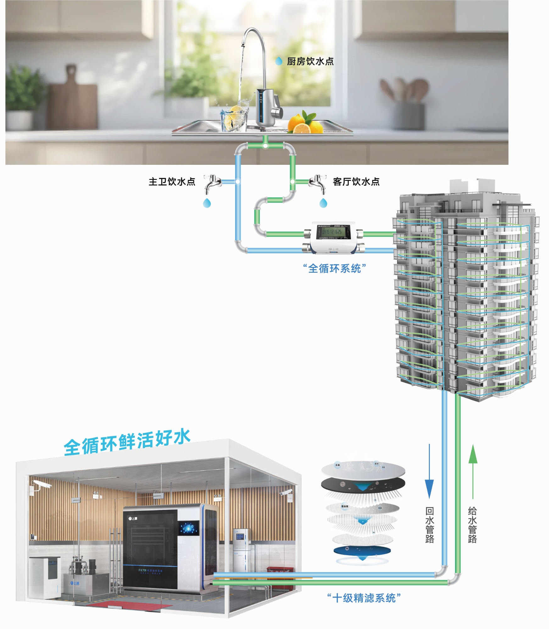 系统通过闭路循环设计与回水消毒机制,实现管网内水体的24小时持续流动。该模式有效避免了因水滞留导致的微生物滋生与水质劣化,确保终端用户在任何时段取水,均为保持流动状态的新鲜供水。